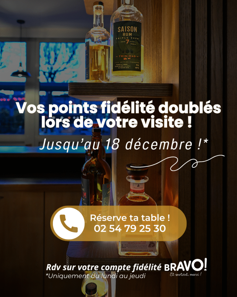 Vos points fidélité DOUBLÉS à chaque repas, jusqu’au 18 décembre inclus !Cumulez deux fois plus de points du lundi au jeudi, en adhérant à notre programme de fidélité Bravo! si ce n’est pas encore déjà fait…A vous les économies 🧡 C’est simple :✔️ Venez vous régaler !✔️ Activez votre compte fidélité Bravo! sur votre téléphone […]