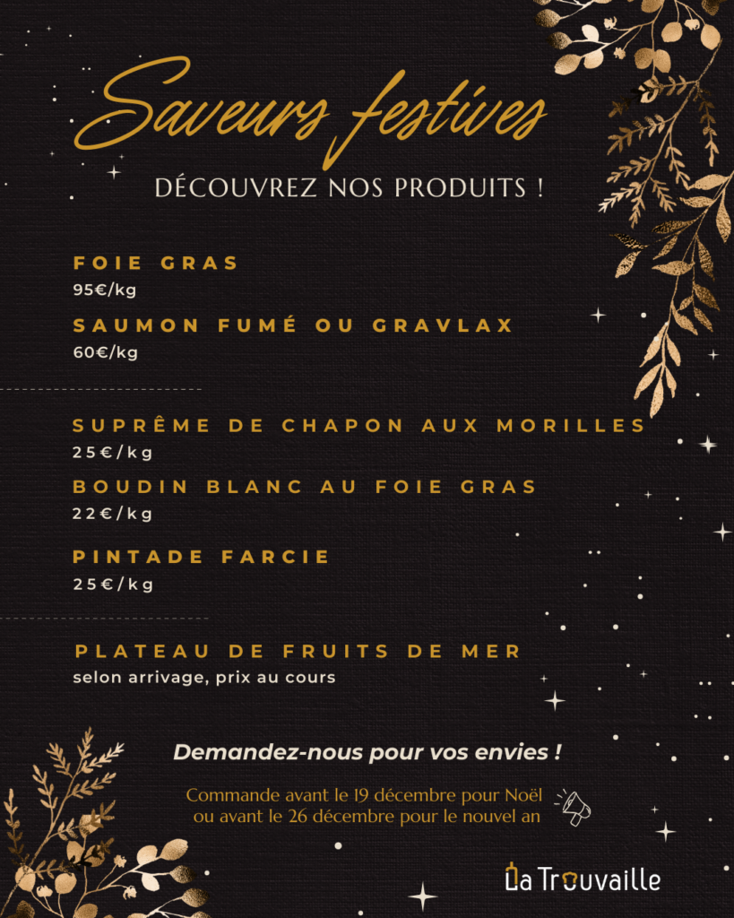Notre carte traiteur est de retour pour les fêtes ! Commande avant le 19 décembre pour Noël ou avant le 26 décembre pour le nouvel an !